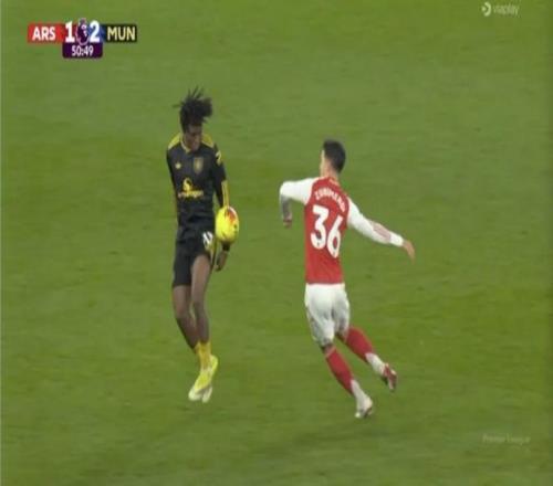 值得一提的是,多古的凌空抽射进球亦被阿森纳球迷认为手球在先。不过,VAR视频助理裁判确认曼联3000万欧元铁闸是用大腿将球停到身前,并不存在手臂触球。
